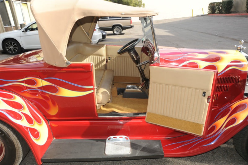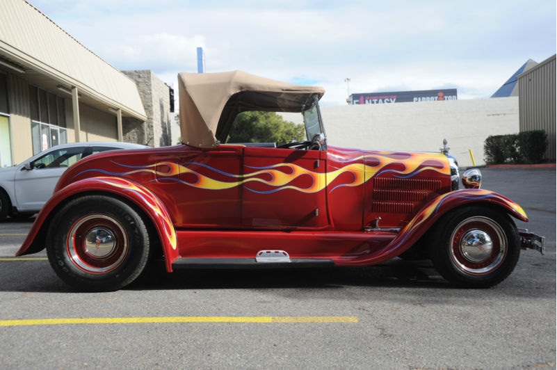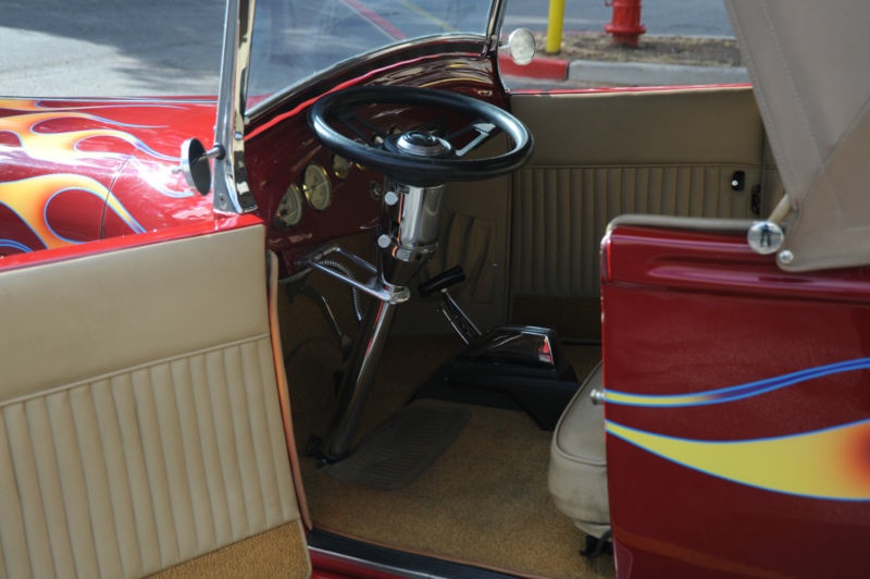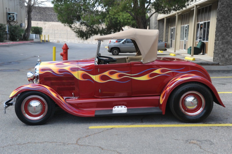 This 1929 Ford Model A Roadster HOT ROD is currently registered in Nevada as 2007 Assembled Vehicle with model designated as 29Ford.  it only has 2700 miles on it since the build..  The front end and fenders is metal and the back end is Fiberglass..  with the very  powerful and dependable Chevy 350 V8 this baby HAULS you know what and will burn the back tires as long as you want.. I know, cuz I tried it out  !!!  This jalopy really flys down the road, on leather seats and canvas convertible top.. has lots of cool goodies such as brass Voodoo gauges, B&M Automatic Shifter… Pioneer Stereo, Tilt steering with Grant Wheel, Chrome radiator ornament with Thermometer, Chrome front shocks and Chrome front bumber,  Cool old skool wheels with Ford hubcaps..  nice near new Goodrich tires with lots of rubber…  keep in mind , that i am selling this for an older gentleman who bought this car from the builder and took great care of it..  and this is just about all we know about the car.. and also that it looks and drives amazing.. does everyrhing right, runs, steers, stops, shifts, etc…     other than that, come to Vegas and see for yourself or buy online with confidence that this is a very cool , fast, fun and dependable Hot Rod for the money !!!!