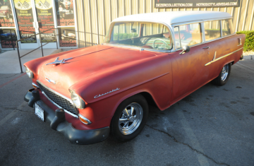 Nevada Car Dealer 40229, Stock # HRC552 – This is your chance to own a rare 1955 Chevrolet 210 Two Door Station Wagon.  This is a great project to Restore or Rat Rod…. most of the hard & expensive mechanical work is already done.. with a newer and fast & solid 350 motor, with Auto Trans & new shifter.   and get this… the last owner spent $2500 to add ICE COLD Air Conditioner … the coldest I have ever felt !  The car also has been upgraded with custom TILT steering wheel, killer stereo with two big speaker boxes in back and MP3 plug in…  recent additions also include electric fan and chrome radiator overflow to keep this baby running nice and cool.  Cragar Chrome wheels, new gas tank and Flowmaster exhausts…. I also had my mechanic go over it and fine tune things like adding new valve cover, oil pan and tranny pan and rear end gaskets, so it does not leak barely a drop !