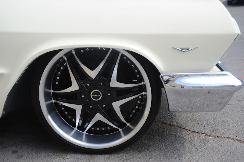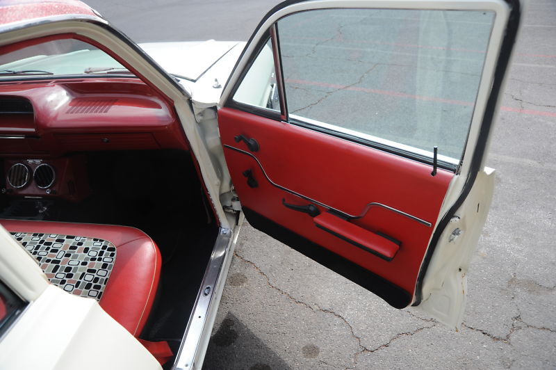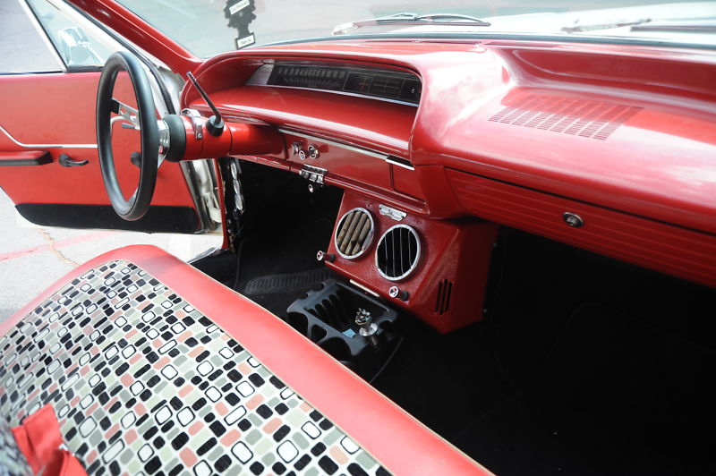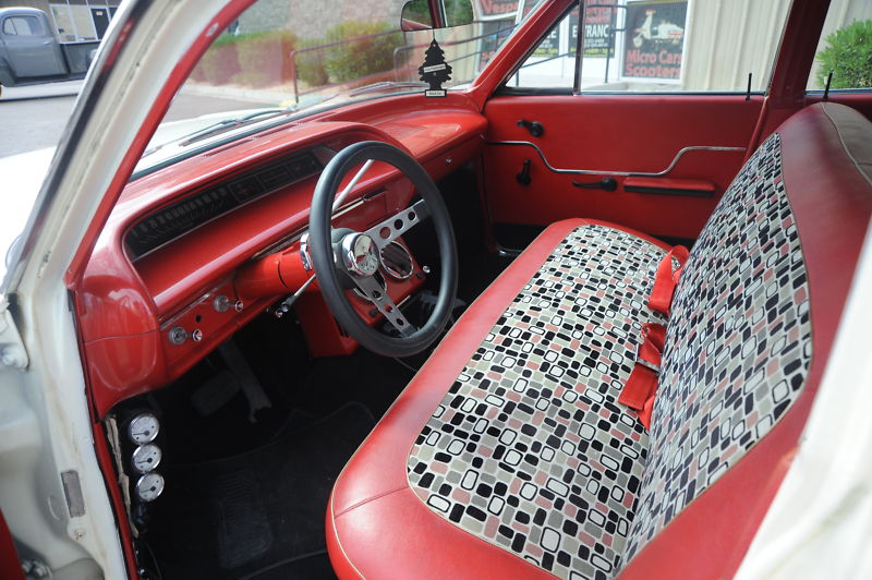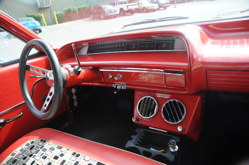 I love this car as my first car was a 63 Biscayne, so this brings back a lot of great  memories…  it has recent new retro 60s mod interior that is in great shape..  the car will seat 6 easily , and that does not count the cargo area in the back that opens for lots of storage and there is a big AC vent in the back that helps cool the back of the wagon.  The dash and interior trim pieces have been powdercoated red with gold metallic… there are seatbelts for both the front and back seat…  the entire floor of the car was dyna-matted to keep out noise and heat…  with new black carpeting.. it has a very nice red headliner..  and of course you will notice the modern pimped out big Strada rims and low profile tires.. but you can easily put back some stock steel wheels with chevy dog dish hubcaps if you wish for a more stock look.. but this car really gets a lot of looks this way… if you are lookng for a fun wagon, a daily driver that the entire family can enjoy, look no further !