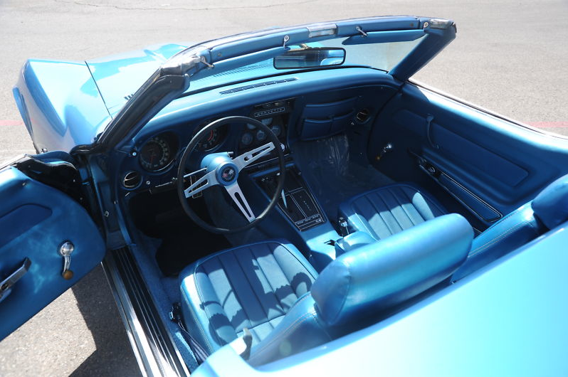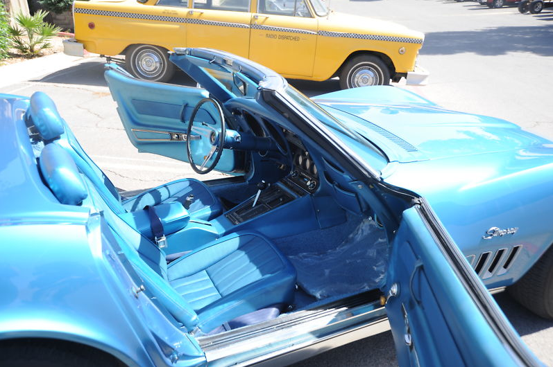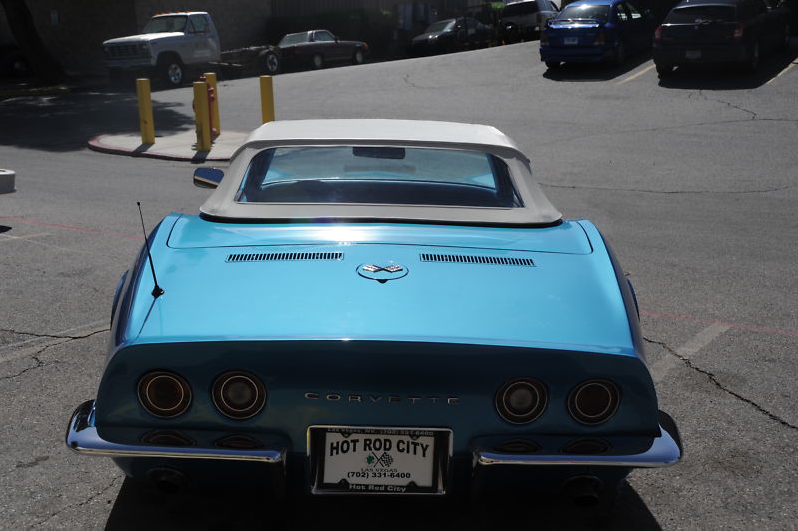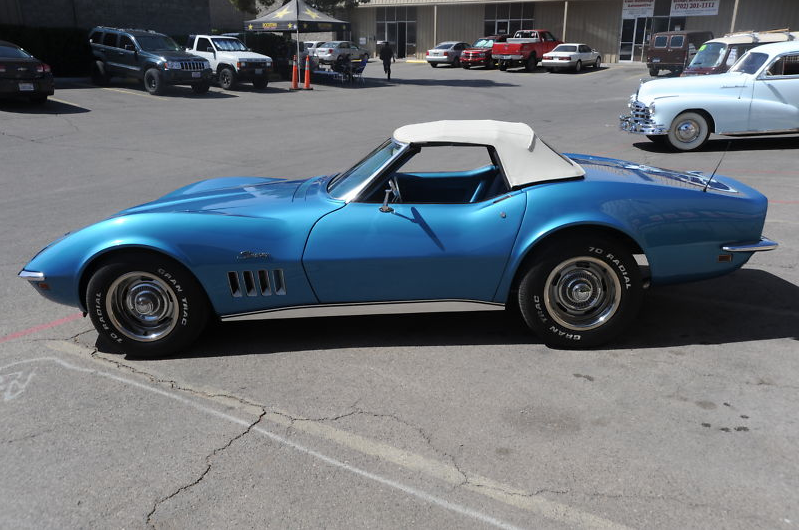This is a very nice driver-quality 1969 Chevrolet Corvette Stingray Convertible !  1969 is my fave year Vette ! The previous owner had a nice stable of cool cars and he drove this one mainly as his Sunday driver….  it has what is believed to be the original 350 Motor with aftermarket Edelbrock 4 barrel carb… motor was rebuilt a couple of years ago, but runs and sounds great !   The Automatic transmission was just recently rebuilt here in Las Vegas and those parts under warranty.   The gauges ALL work — even the clock.   They were repaired or replaced by Outlaw Classics of Las Vegas.   The Vette has recently new Blue seats and brand new matching blue carpeting.. there is just one small crack in the blue dash pad.  The Marina Blue paint job is very nice and presents well.. there are just a few minor fiberglass stress cracks in the hood and minor nicks from driving it here and there.   It has the cool original type Ralley Wheels and nice tires with rubber to spare… fairly new exhaust system.   Has a newer white convertible top with clear plastic back window.. goes up and down smoothly and works well and looks good.    This is a very fair Corvette for the price… buy it and drive it as is, or fix it up and make it even nicer.. up to you !!! It’s not perfect of course, but a hellava lot of fun!