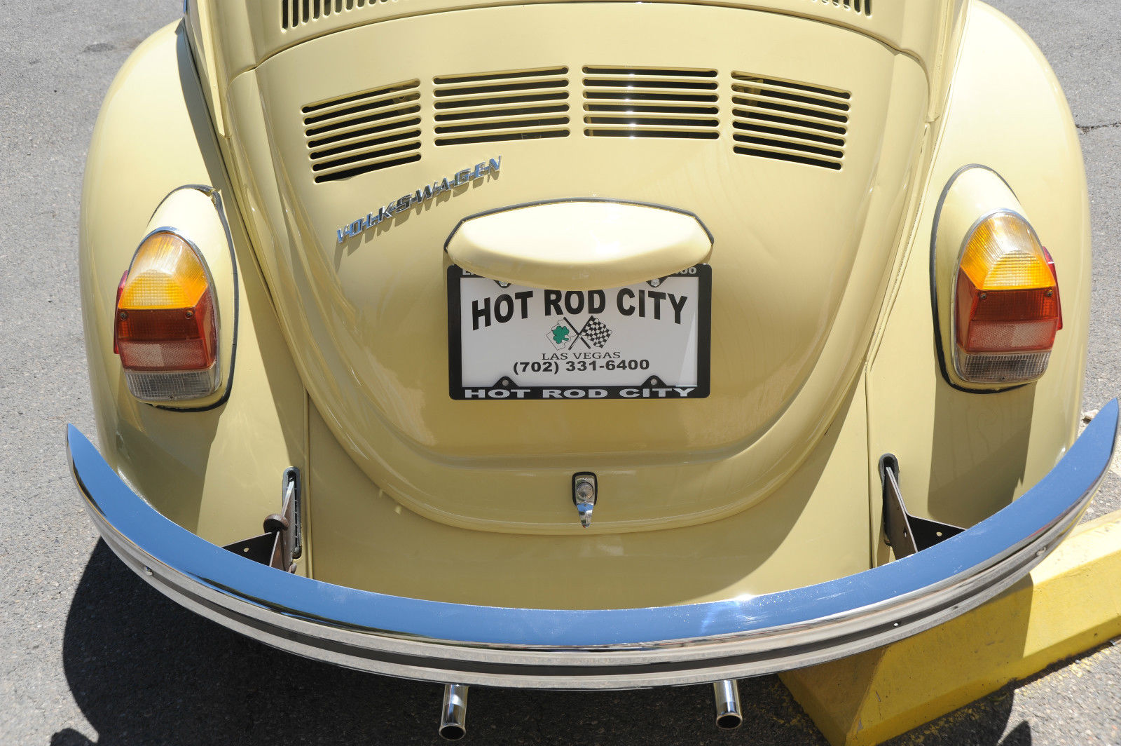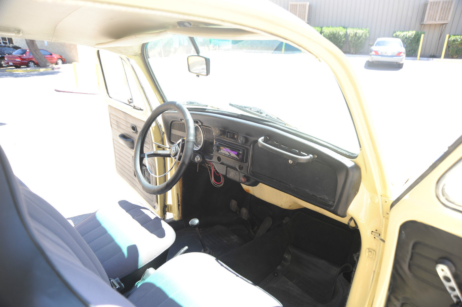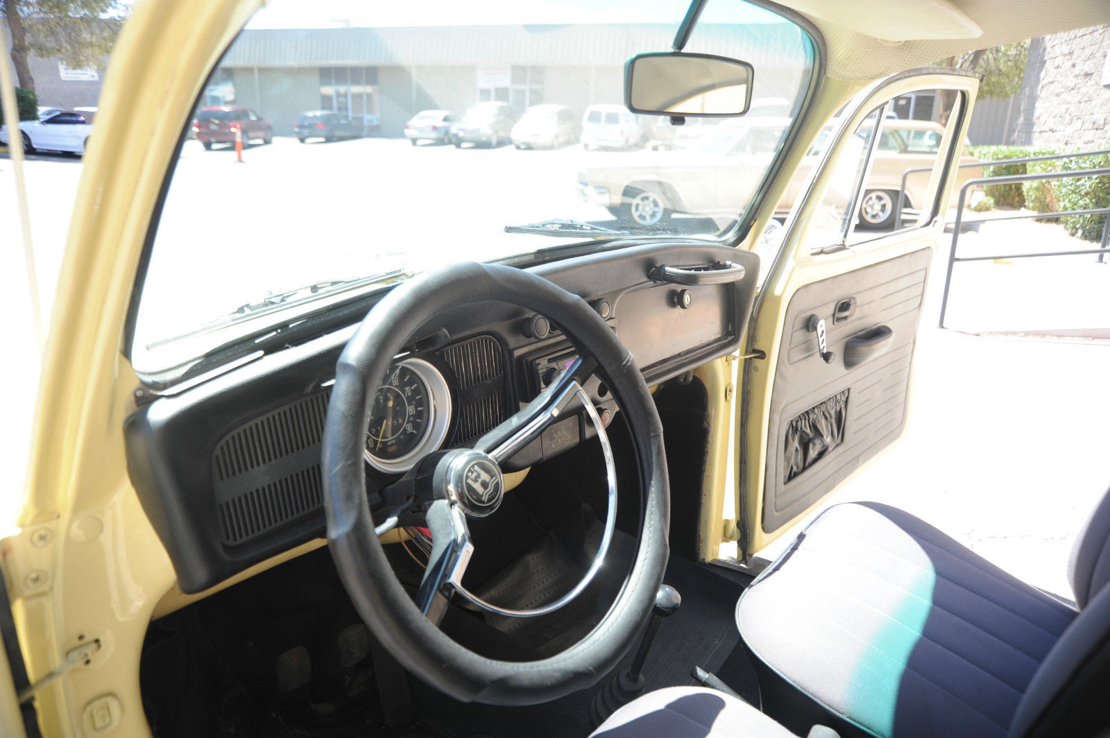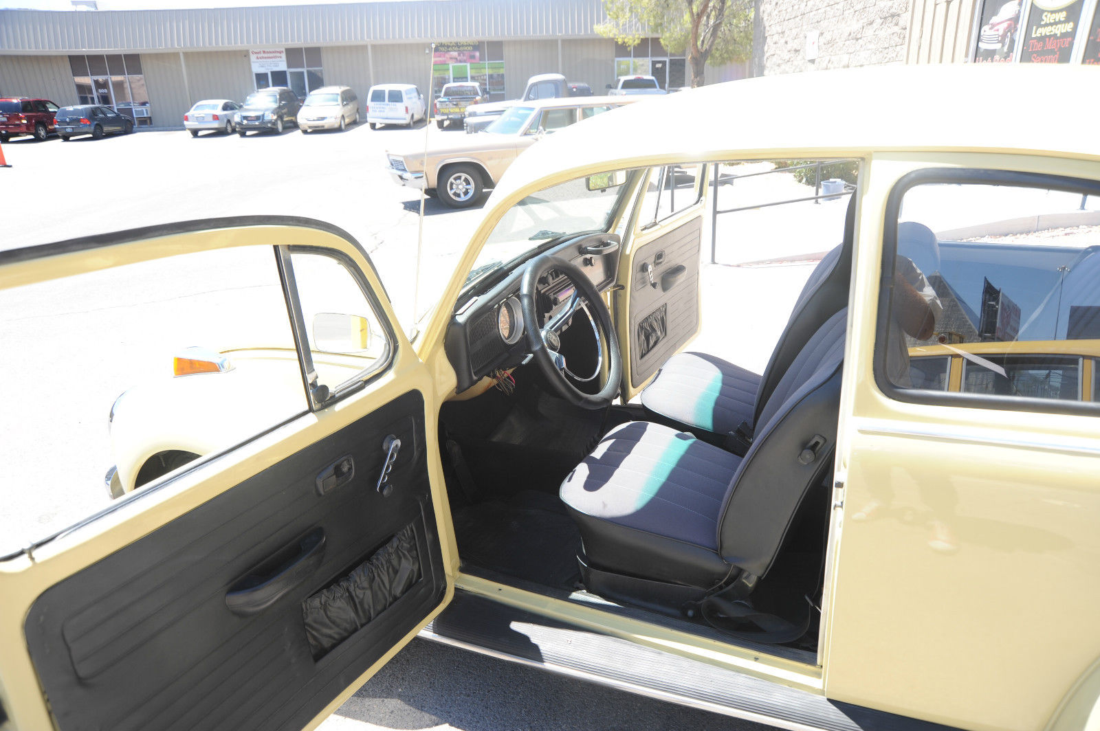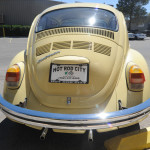 Has recent new  Shantung Yellow Paint, New or almost new Grey Seat material and Black door panels, it starts right up and runs strong and true easily at 70 to 75 mph… great steering and brakes… you can’t go wrong with this cute little yellow Bug !   The only thing I see is some slight rust specs on the wheels and trim… a little on the door handle… and some oxidation of the original trim… and some fading on top of the Back Taillights.  Overall a very nice car for the money !!!