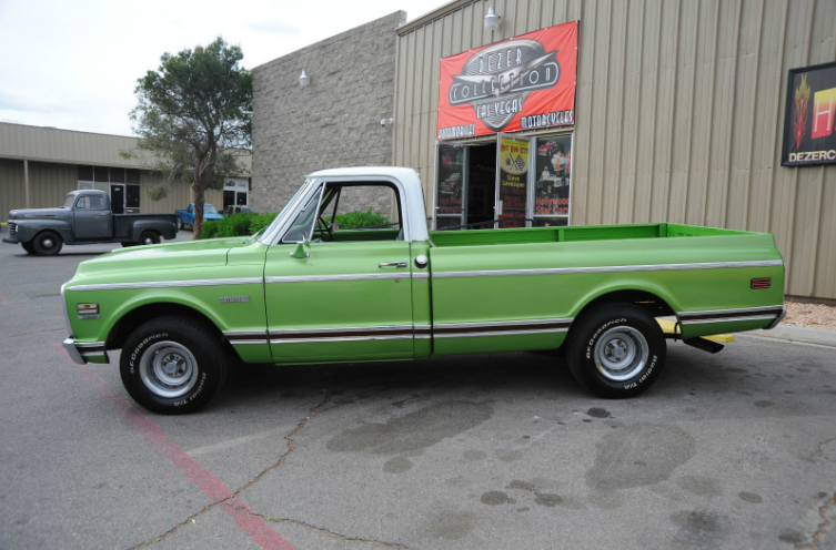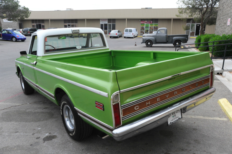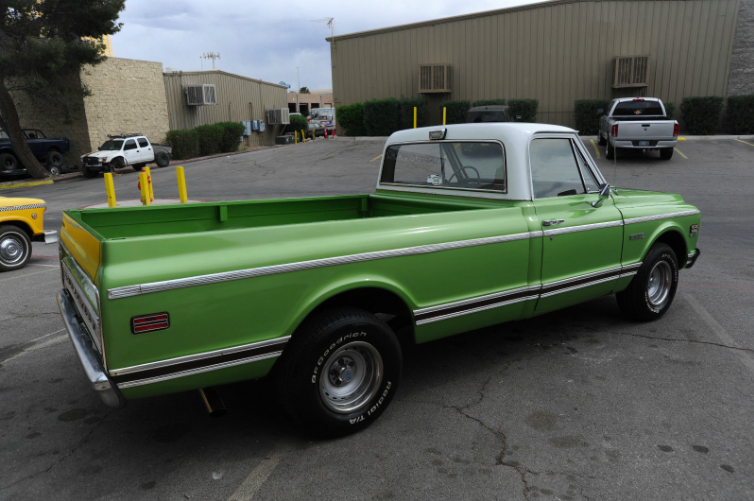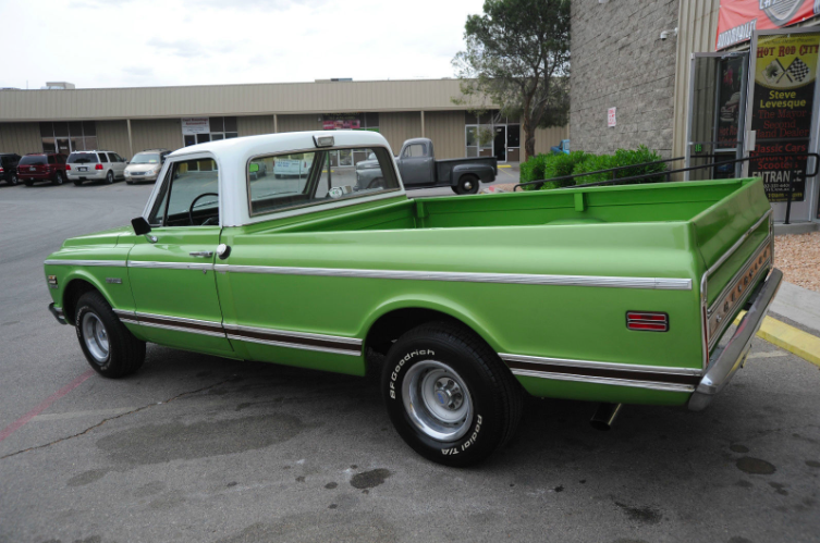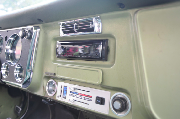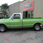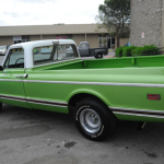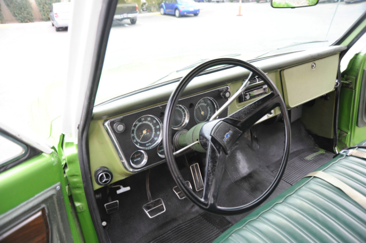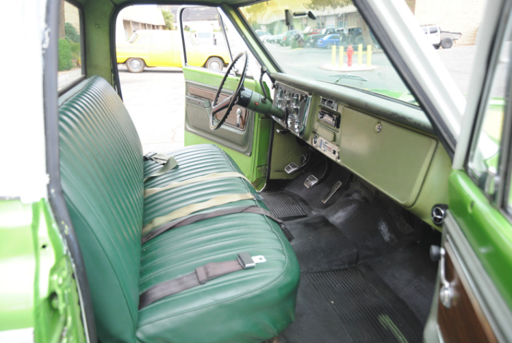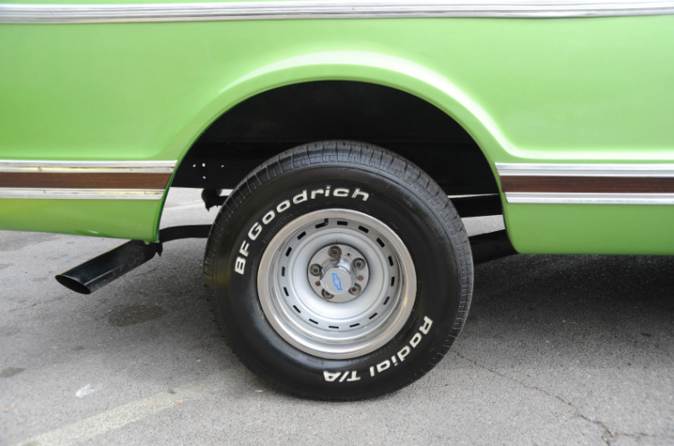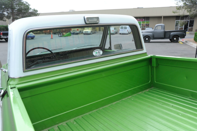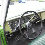 Under the hood is what looks to be the original 350 Chevy motor, but it’s been blessed with a Rochester 4 Barrell performance carb that is tuned to a gnat’s ass ! Runs like a bat out of hell, but nice and smooth as well.    MSG Electronic ignition, modern Power Steering and Brakes,  and it has been updated with ICE COLD Modern Vintage Air Conditioning and also a Modern Bluetooth Stereo…. The 3 on the Tree Manual Transmission is so much fun to drive with all this Power !!!! NIce seats and Headliner and 3 sets of seat belts, so 3 people can cruise Old Skool Style !    Brand new BF Goodrich T/A Radials… nice door panels… this truck needs nothing…  Please don’t buy it and turn it into a show truck.. just buy it and enjoy it AS IS… and you will be so glad you did !!!!