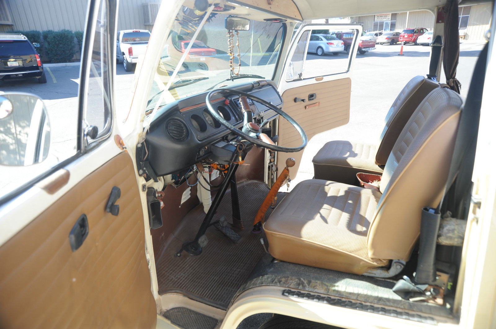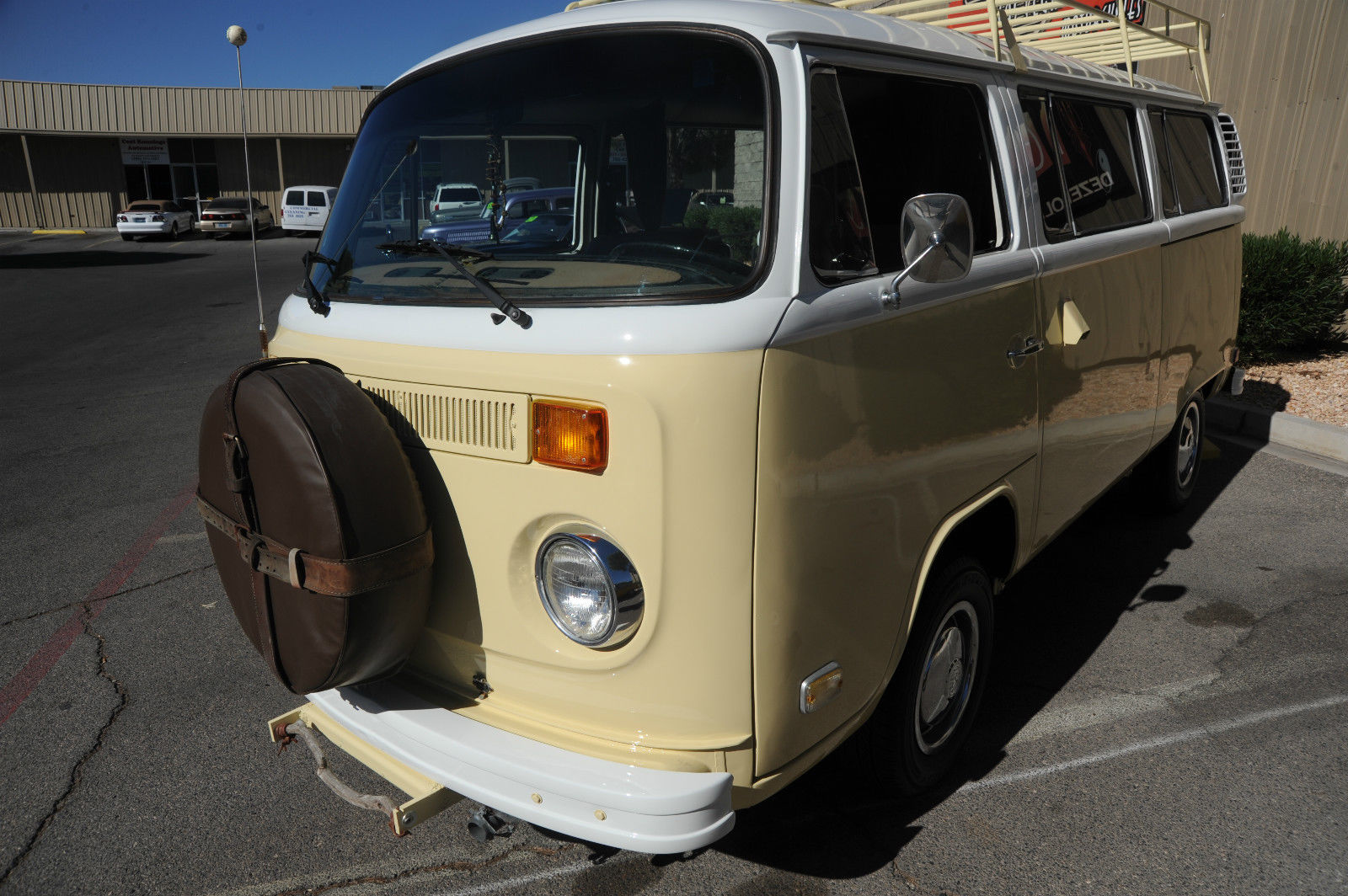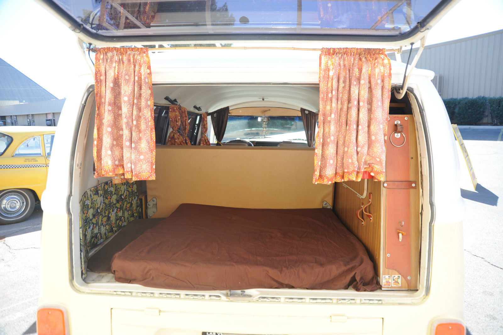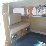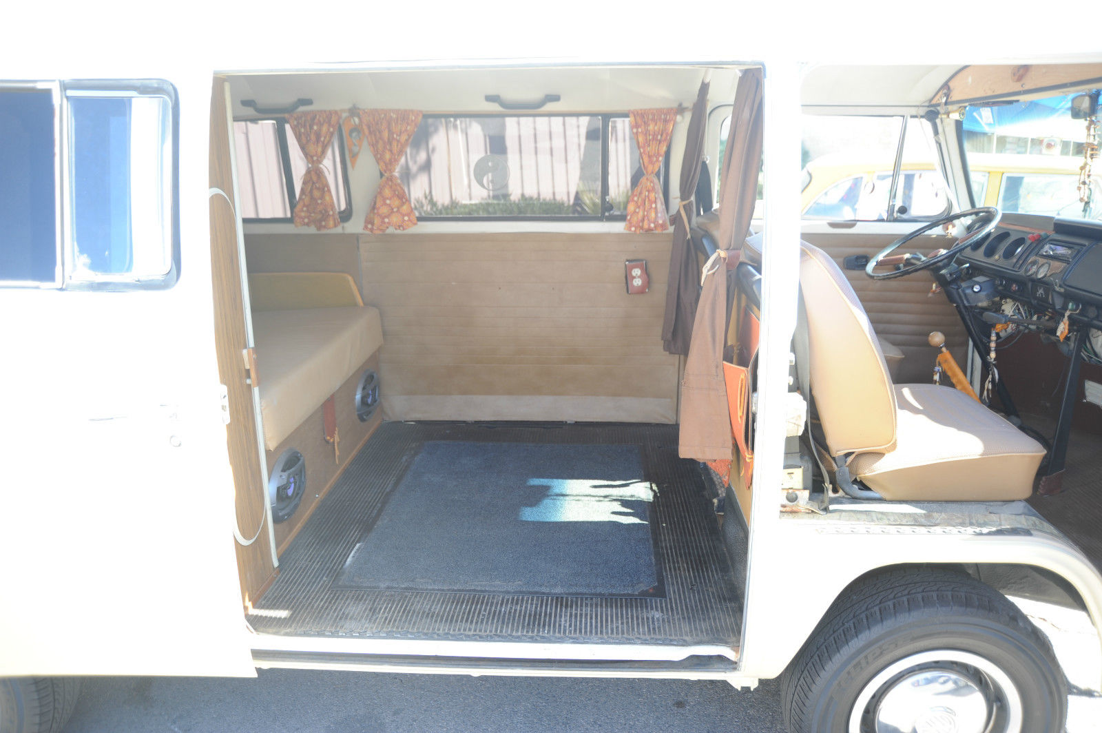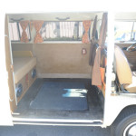 A 1974 VW Kombi Bus… with BRAND NEW PAINT & BODY WORK …  great stock creamy tan color with white top… even the roof rack (a $1000 value) is painted to match. I can’t say enough about this cool bus… lots of Hippy or Native American leather accents really put a smile on your face and create a good Karma.    The desireable 1800 cc pancake motor runs great and the 4 speed manual tranny shifts smoothly and surely.   It has a newer Pioneer CD stereo with big 6×9 Sony speakers in back and 4×6 speakers in front to fill the bus with tunes as you are putting down the road.   Interior is very nice with tinted windows, curtains, nice interior and headliner without and obvious rips or tears. the nice couch turning into a big bed…  bright chrome hubcaps and rims with newer Toyo tires.  Spare tire mounted on front with cool brown leather cover. New locking gas cap. If you are looking for a trouble-free and nice looking and running camper bus, this is the one for you !!!   We have listed the actual odometer but as always with classic cars.. True Mileage is Unknown.