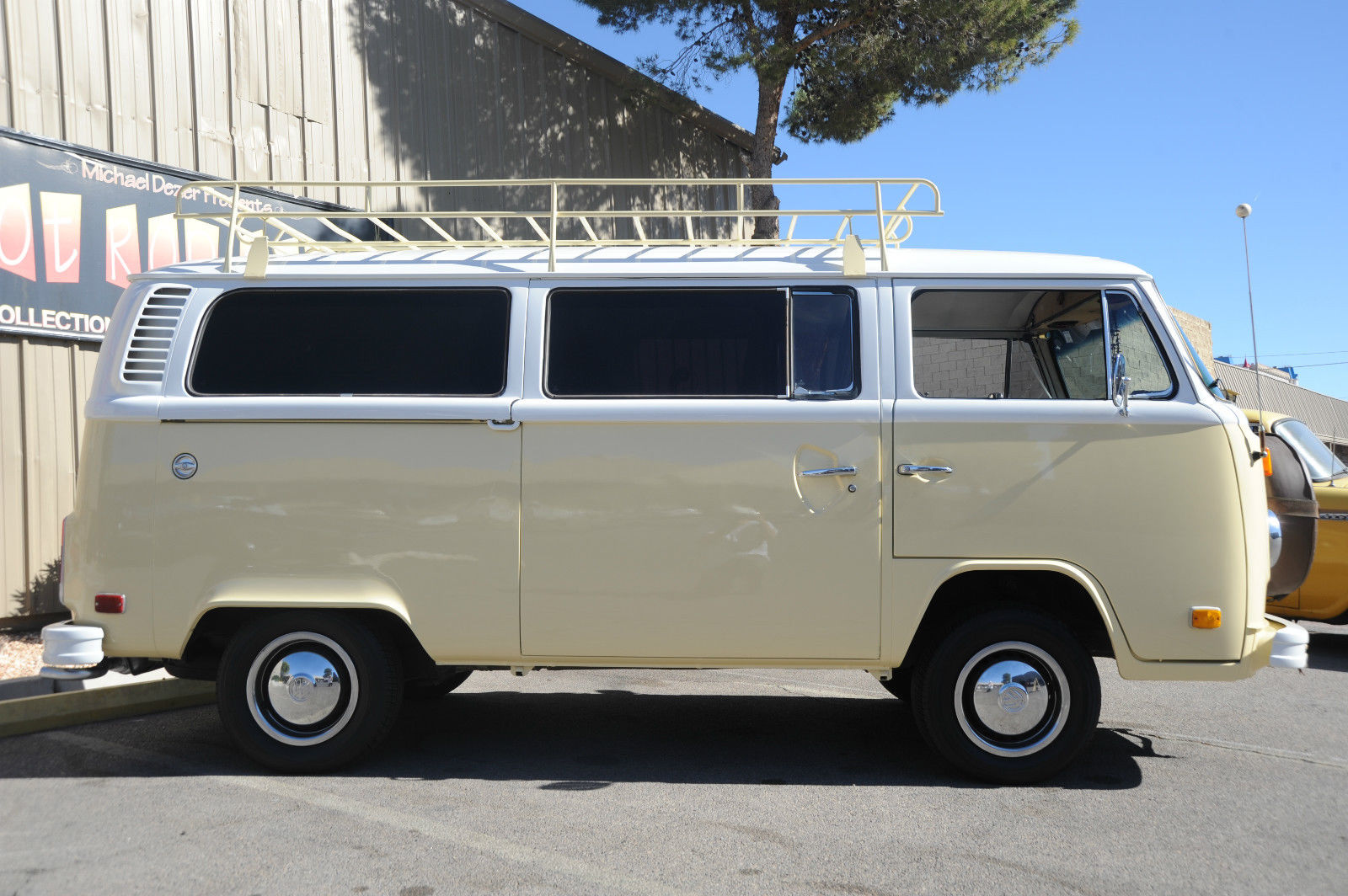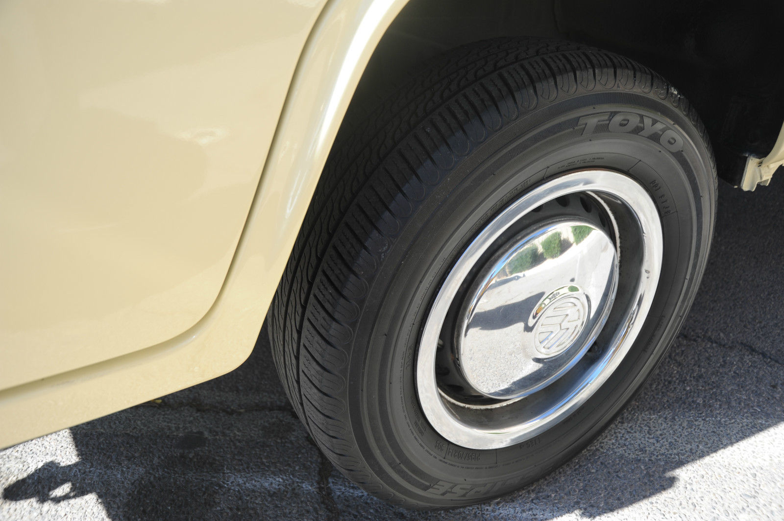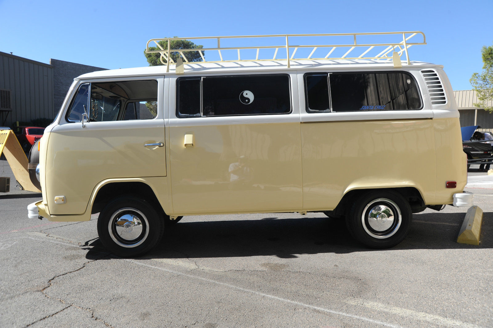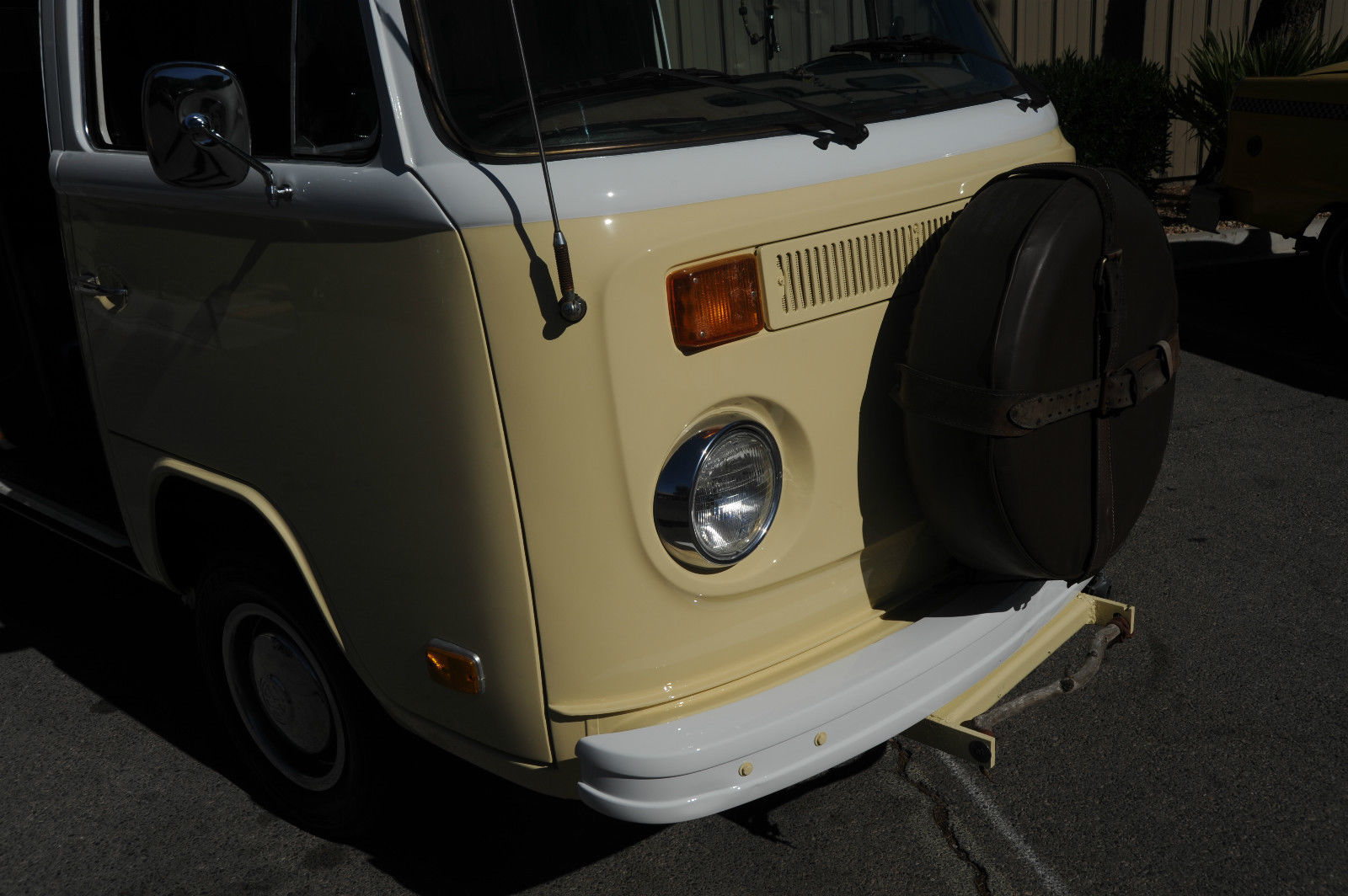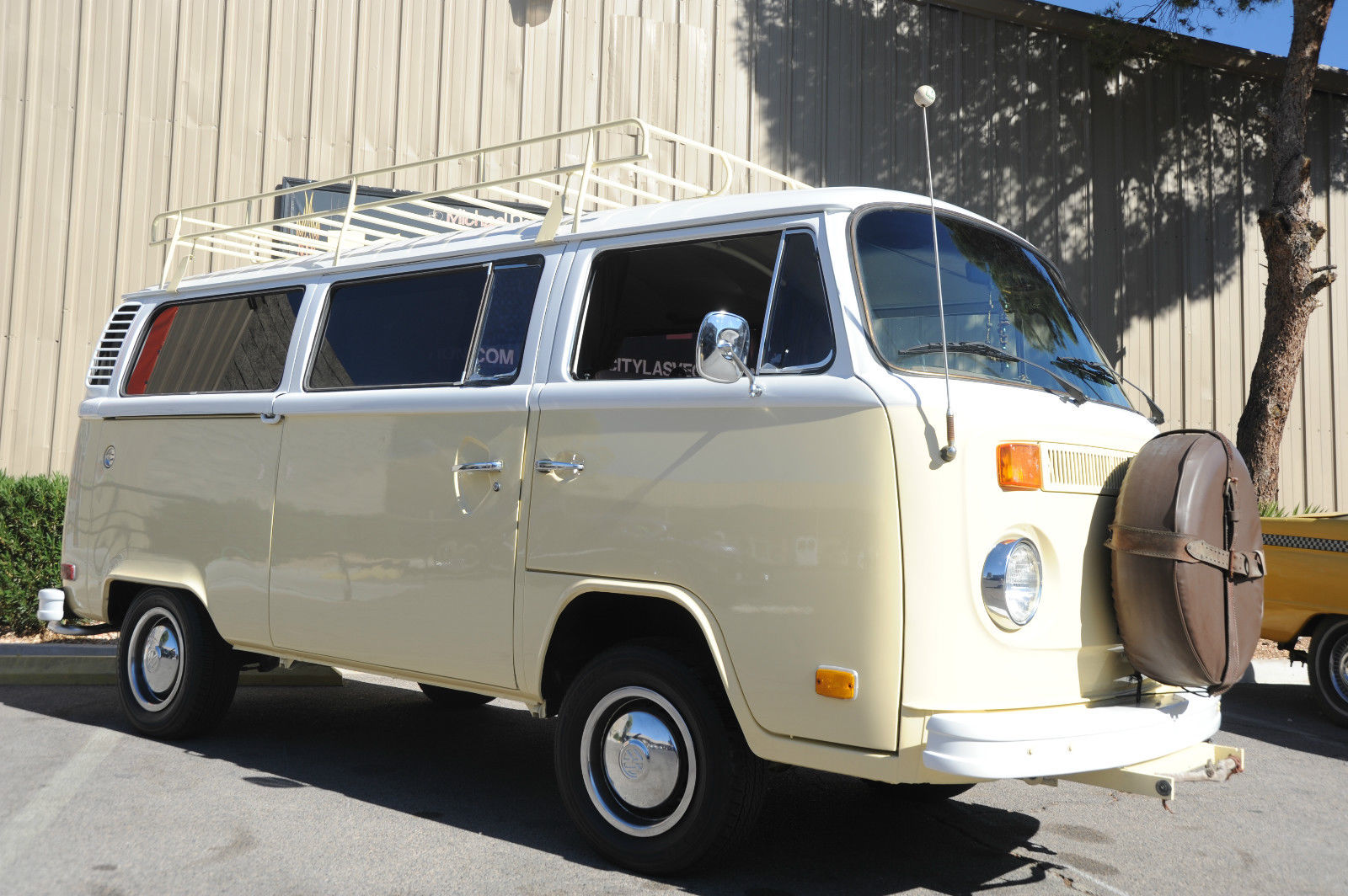 A 1974 VW Kombi Bus… with BRAND NEW PAINT & BODY WORK …  great stock creamy tan color with white top… even the roof rack (a $1000 value) is painted to match. I can’t say enough about this cool bus… lots of Hippy or Native American leather accents really put a smile on your face and create a good Karma.    The desireable 1800 cc pancake motor runs great and the 4 speed manual tranny shifts smoothly and surely.   It has a newer Pioneer CD stereo with big 6×9 Sony speakers in back and 4×6 speakers in front to fill the bus with tunes as you are putting down the road.   Interior is very nice with tinted windows, curtains, nice interior and headliner without and obvious rips or tears. the nice couch turning into a big bed…  bright chrome hubcaps and rims with newer Toyo tires.  Spare tire mounted on front with cool brown leather cover. New locking gas cap. If you are looking for a trouble-free and nice looking and running camper bus, this is the one for you !!!   We have listed the actual odometer but as always with classic cars.. True Mileage is Unknown.
