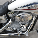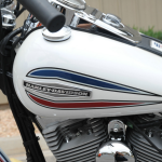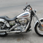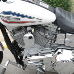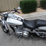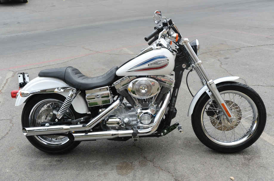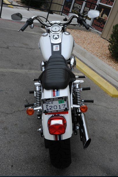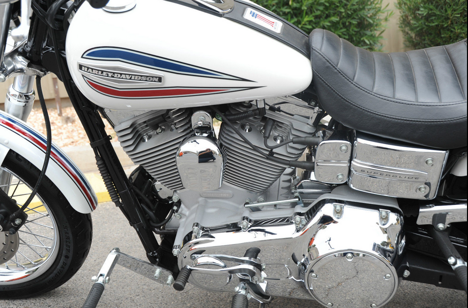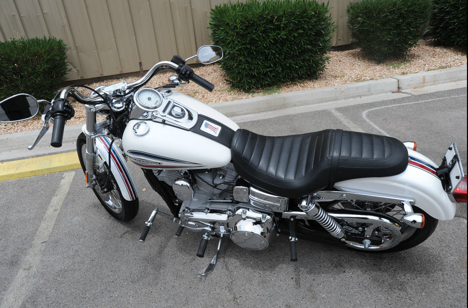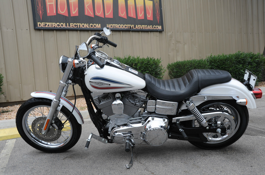 NICE !   2006 Harley Davidson 35th Anniversary of the SuperGlide !  This is my personal bike.. my 3rd or 4th Harley but the one that means the most to me…  unfortunately, another new baby in the family means I won’t have time to ride for a while and I don’t want this bike to sit… it was meant to be ridden.  But I remember back in 1971 walking to school and going into Fullerton Harley Davidson and seeing my first Harley…. back then all they had was one rack of black t-shirts a stack of oils cans and just a few bikes.. big bikes and sportster… that is when I saw the 1971 Superglide. sort of Evil Kneivel colors like the US flag with the #1 sign all in Red, White and Blue.. it was a shovel head with the fiberglas boattail fender !   I always wanted that bike….   then it happened again..  a few years ago, I walked into Harley and Las Vegas and spotted this bike, fell in love all over again and had to have it…  the bike is well maintained with just a little over 14K miles….   it has added Screaming Eagle exhaust and fold up highway bars.. the bike runs and looks great.. I love the white pearl paint and once again the Red, White and Blue accents and the Harley #1 emblem.  The bike is a blast to ride and needs nothing !     Here are some Harley stats on the bike … look it up, and you will see this and the original 71 Superglides are very special bikes !
